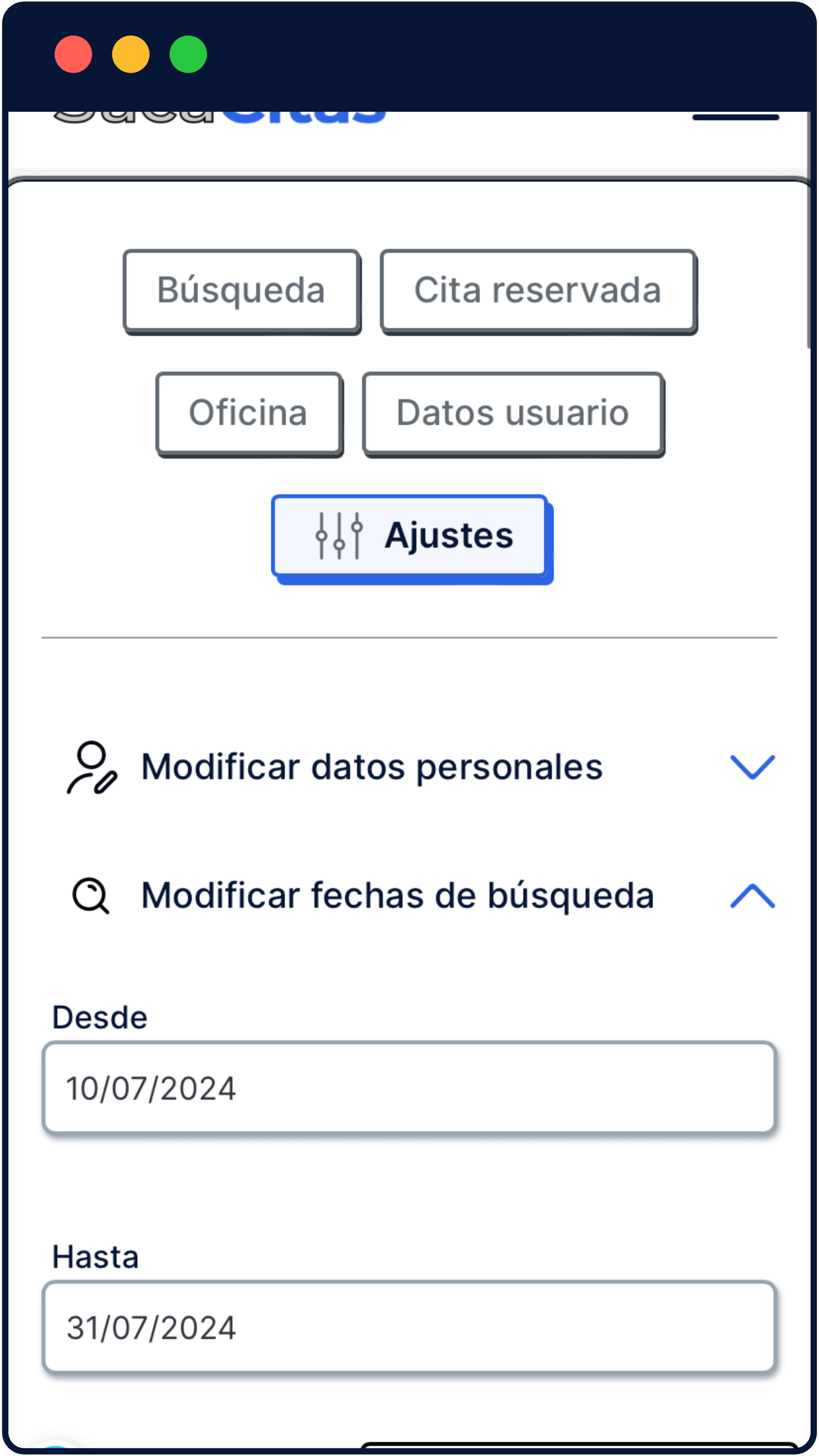 Accede a tu perfil personal o link privado de búsqueda. Desde esta sección podrás comprobar el estado de búsqueda de la cita, modificar las fechas de búsqueda y realizar otros ajustes. En caso de que se reserve la cita toda la información aparecerá en tu perfil.